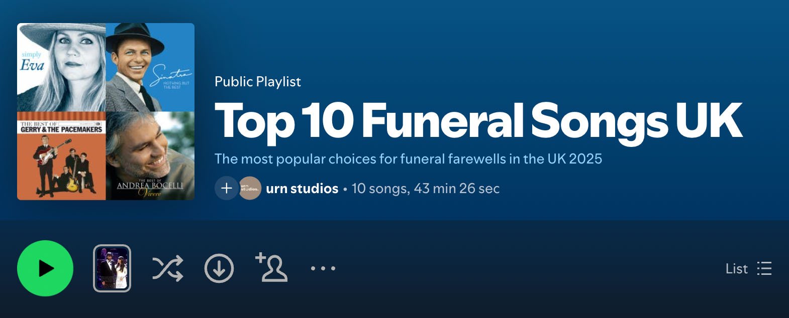 To help offer inspiration, we have included a list of the most popular funeral songs, as well as a selection of quirky and unexpected choices, and finally a personally curated list of less common but equally meaningful songs for those looking for something a little different. Together, these suggestions are intended to help families find music that feels fitting, comforting, and reflective of a loved one’s story.