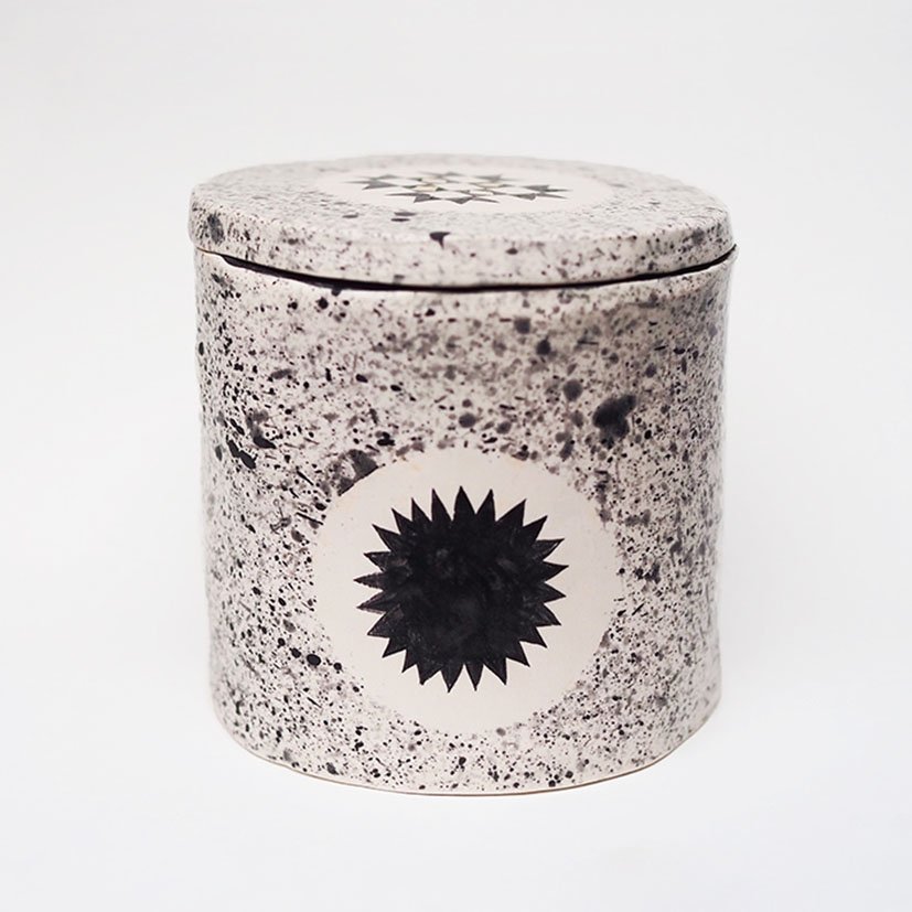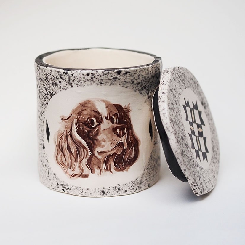 These bespoke pet portrait urns by Evie May Adams are created individually to honour your pet with a hand-painted illustration. Made in stoneware and finished with a soft silken-matte glaze, each piece features Evie’s signature speckled surface, a personalised portrait in black or chestnut stain, a star detail on the back, and her geometric patterned lid.